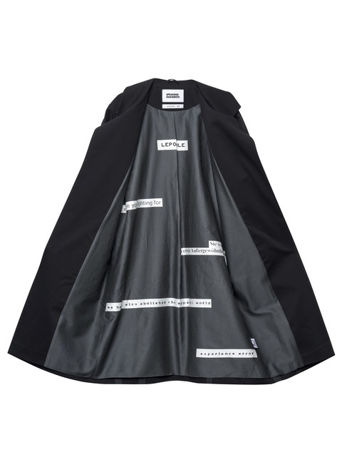 Das erste Teil der Edition ist ein Mantel der auf dem Werk Mirror of nothingness basiert. Die Arbeit wird in einzelne Stripes übersetzt, aufwendig silberfarben bedruckt und präzise dem Werk entsprechend auf den Mantel gesetzt.