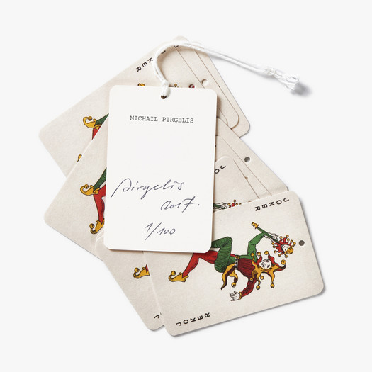 Each garment is sold with a numbered certificate, hand-signed by the artist and printed on a Joker image from Pirgelis’ collection of airline playing cards.