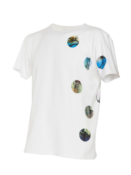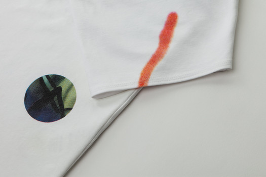 A T-shirt rounds up the collection, sporting circular cut-outs in the piece - positioned at precise locations on the front and back, where they were removed from the image - and revealing a 'final version' of the painting. The T-shirt is handsewn and made in Cologne.